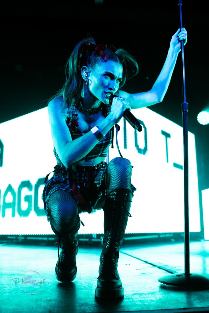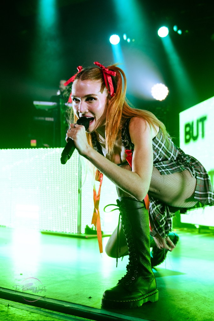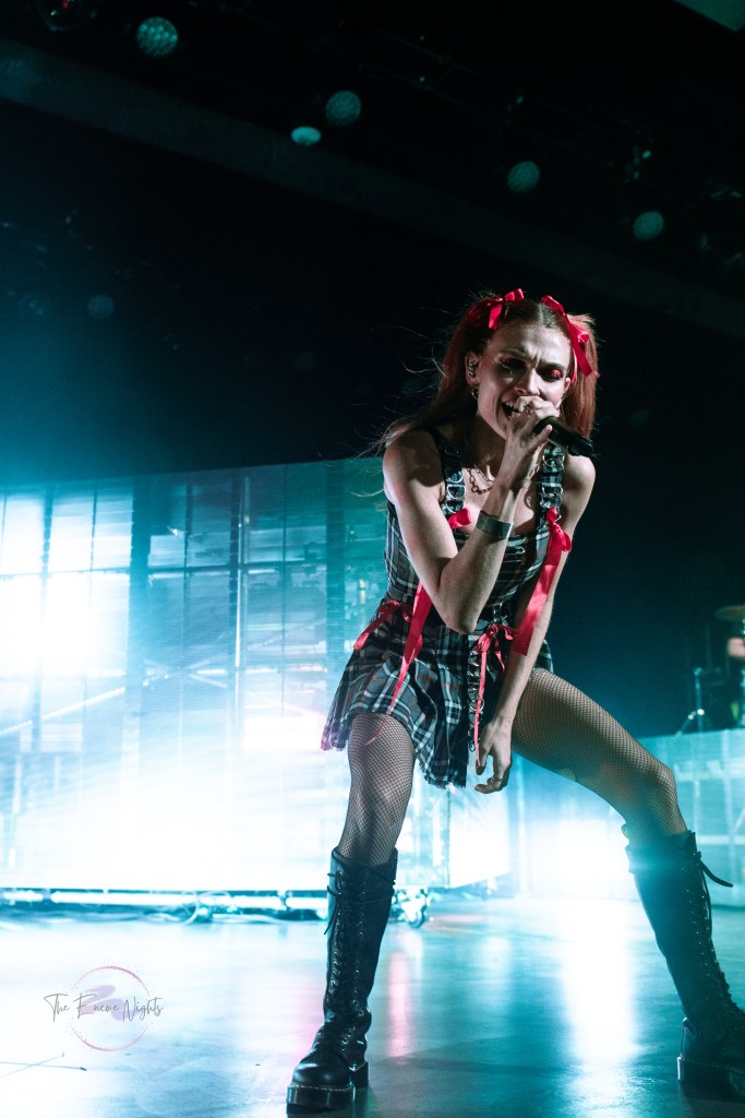 After playing a few songs from Nosebleeds, they took a break from the new album and played “whywhywhy,” a song off their 2020 album, SUPERBLOOM. After “whywhywhy,” they continued on with playing more of Nosebleeds. During song “Ultraviolet” Mandy went to the top of the LED screen once more, but this time with arrows stuck in her back. After this, Mandy came back to the stage with the rest of the band and they once again took a break from the Nosebleeds songs and played “SUPERBLOOM.”