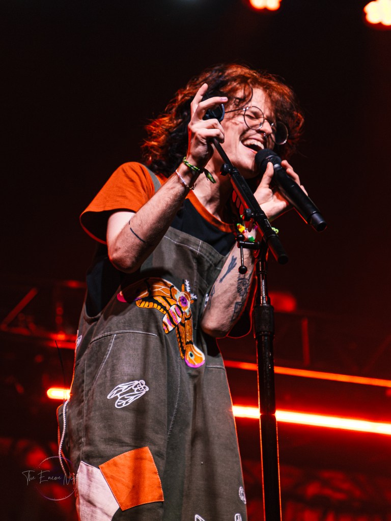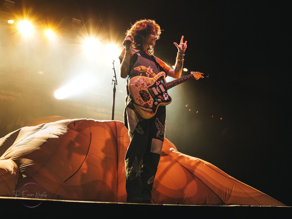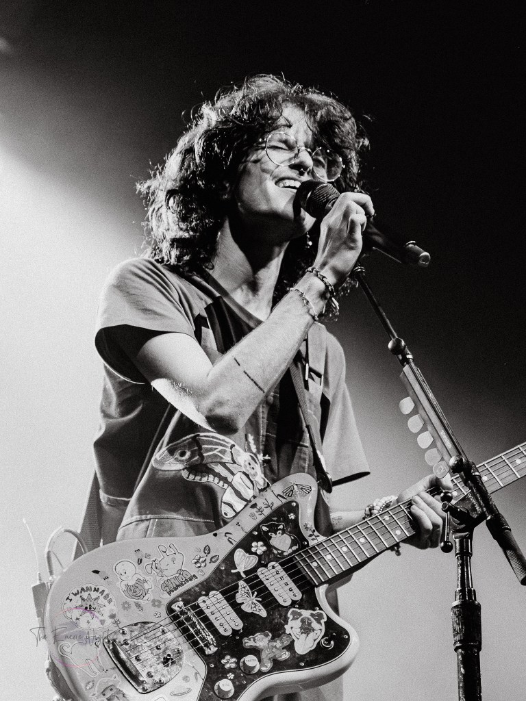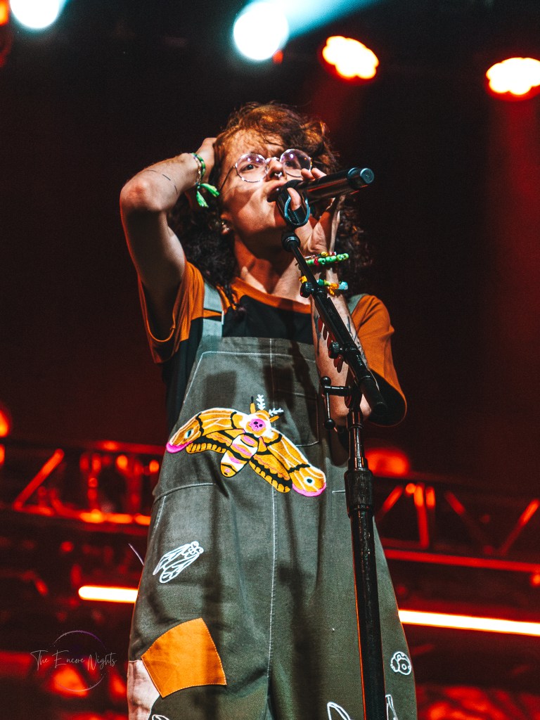 Adorned with moss and inflatable mushrooms, along with a tree stump directly in the middle as a pedestal, Cavetown took the stage with “let them know they’re on your mind”. Although a striking difference to the bands before him, frontman Robbie Skinner was able to still bring a rock-styled edge to his traditional indie-pop style. One minute he’d have the crowd chant for one of his touring staff dressed up in a frog costume, and then the next he’d be pouring his heart out over songs like “Green” or “Juliet”. It was clear to see just how personal these songs felt to the crowd as a lot of Cavetown’s discography touches on serious topics such his struggle with gender and sexual identity, mental health, and navigating love while on the aromantic and asexual spectrum. Closing out the show with “Boys Will Be Bugs” and an encore of “888” and “Devil Town”, it was hard to find a dry eye in the house as Robbie wrapped himself in a transgender flag gifted by a fan and giving his all one last time.