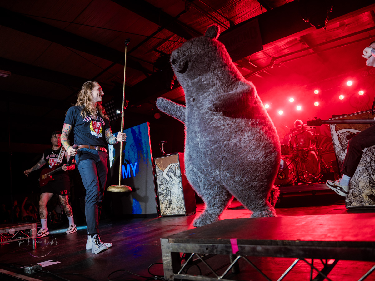 In OKC, the first headliner to take the stage was The Home Team, a pop-punk act hailing from Seattle. Of the bill, THT were the act that I was the least familiar with going into the night, and they definitely won myself (and probably many others) over by the end of their set. I knew right away that we were all in for some major entertainment as soon as the band took the stage, because before any of the musicians came out, there were two individuals dressed in a rat and elephant costume, respectively, that came out and started dancing around while the rest of the band began to assume their positions. The band recently dropped their third album, The Crucible of Life, back in July, and they highlighted this album the most throughout their set, opening with “Brag” and closing with the album’s lead single “Loud”. Vocalist Brian Butcher has an amazing range that goes back and forth between smooth and jazzy and aggressive with an ease unlike most, and the rest of the band is pretty great as well.