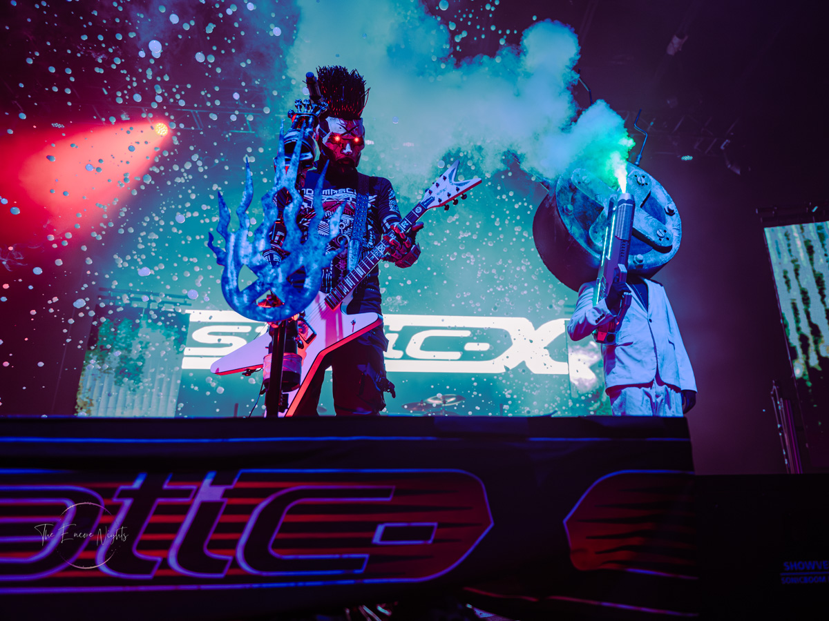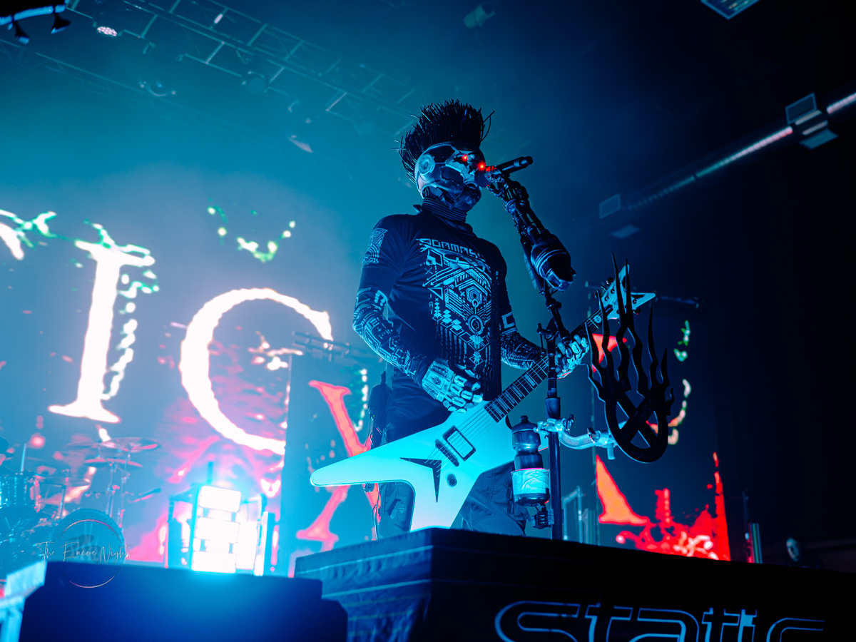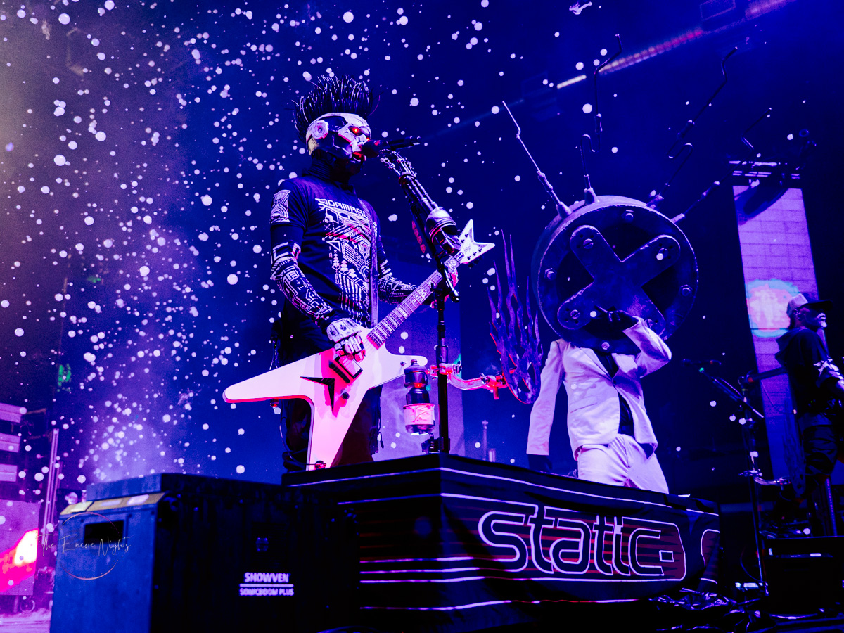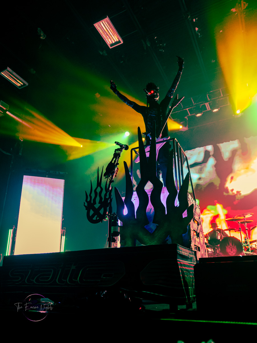 Finally, around 9:30 p.m., it was time for Static-X to take the stage, and not only did they take it – they completely commanded it. Founding members Ken Jay, Koichi Fukuda and Tony Campos kicked things off instrumentally while new frontman Xero emerged on a platform towering over the stage as the band launched into “I Want to Fucking Break It”, followed by “Cannibal” and more recent release “Terminator Oscillator”. The overall setlist skews heavily toward tracks from their Wisconsin Death Trip album, understandably so given it’s their most popular, but there are definitely a few tracks from other eras sprinkled in as well.