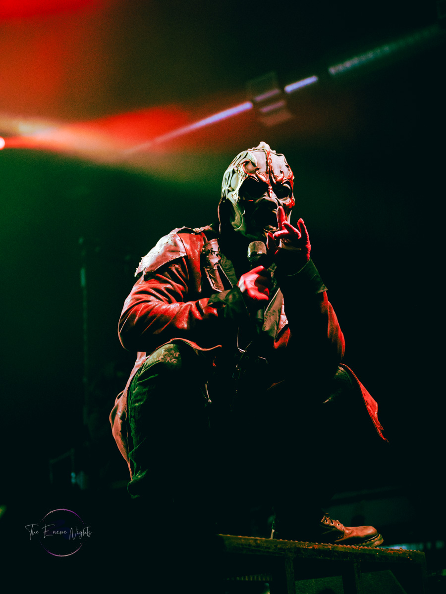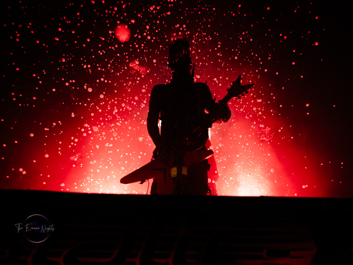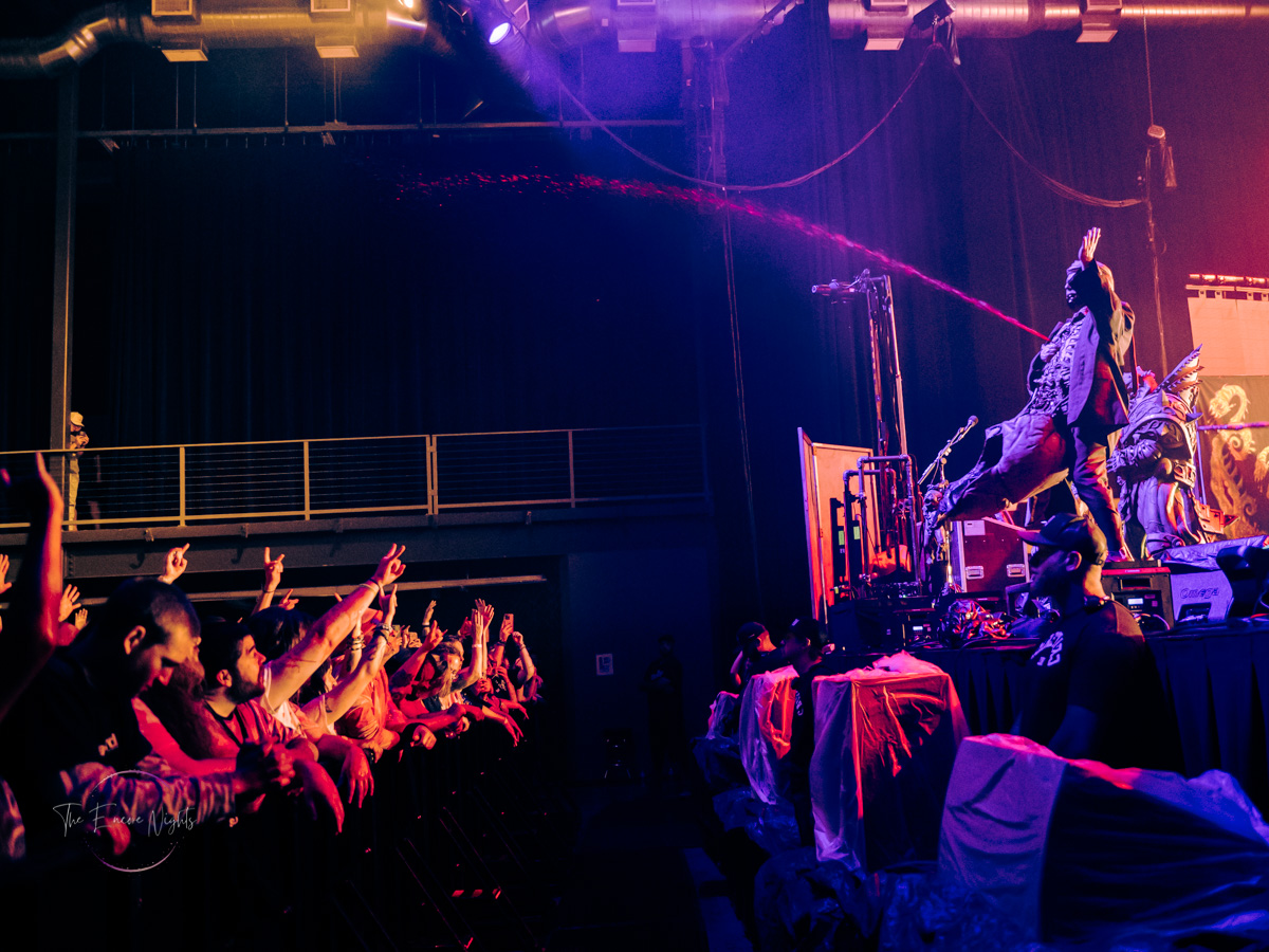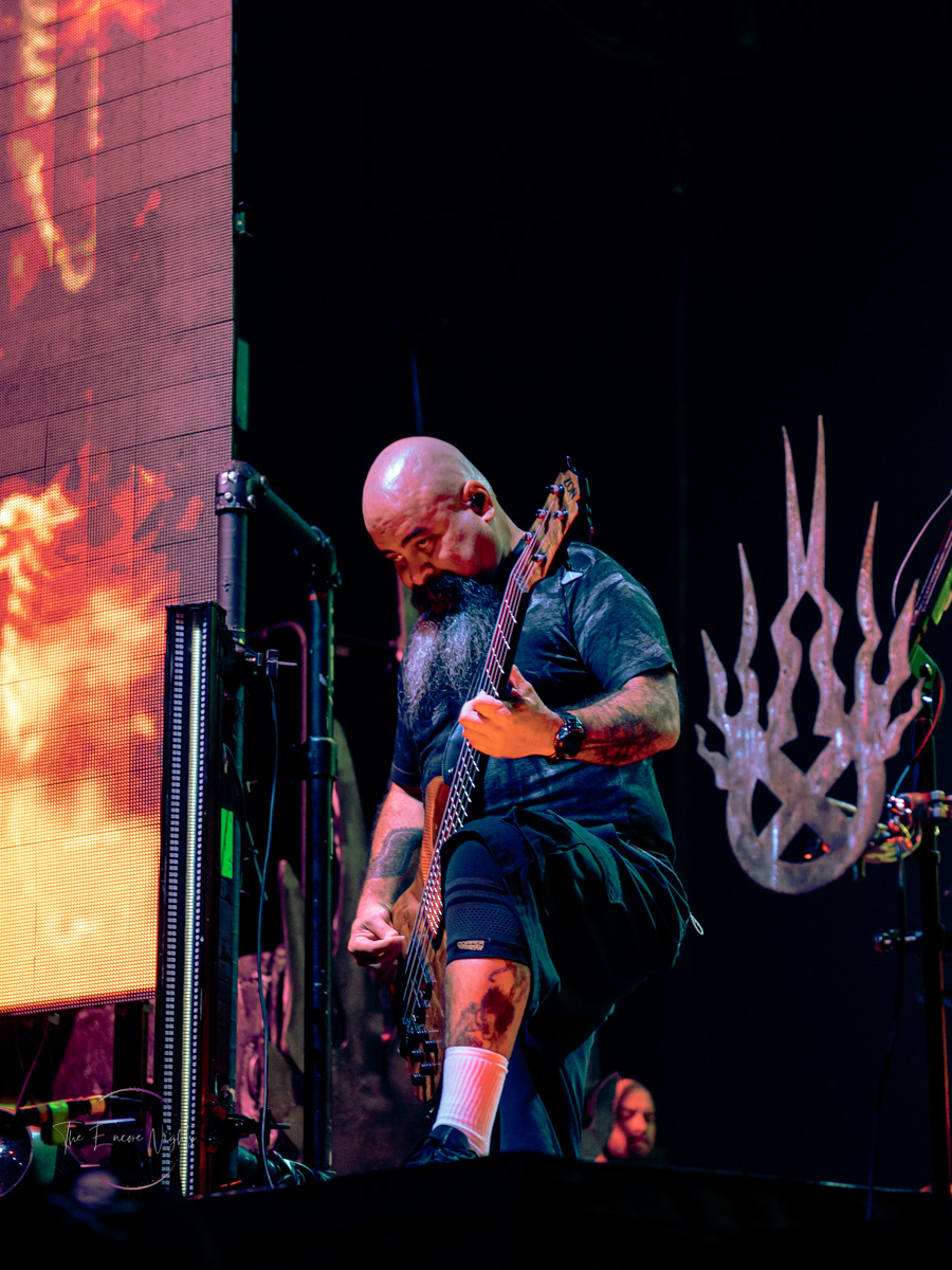 Finally, around 9:30 p.m., it was time for Static-X to take the stage, and not only did they take it – they completely commanded it. Founding members Ken Jay, Koichi Fukuda and Tony Campos kicked things off instrumentally while new frontman Xero emerged on a platform towering over the stage as the band launched into “I Want to Fucking Break It”, followed by “Cannibal” and more recent release “Terminator Oscillator”. The overall setlist skews heavily toward tracks from their Wisconsin Death Trip album, understandably so given it’s their most popular, but there are definitely a few tracks from other eras sprinkled in as well.