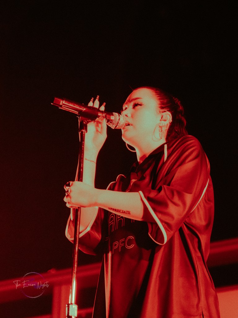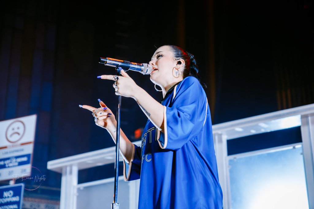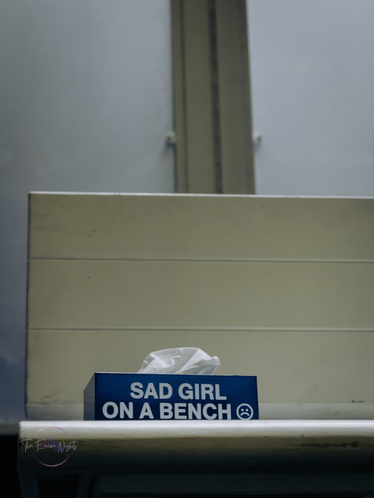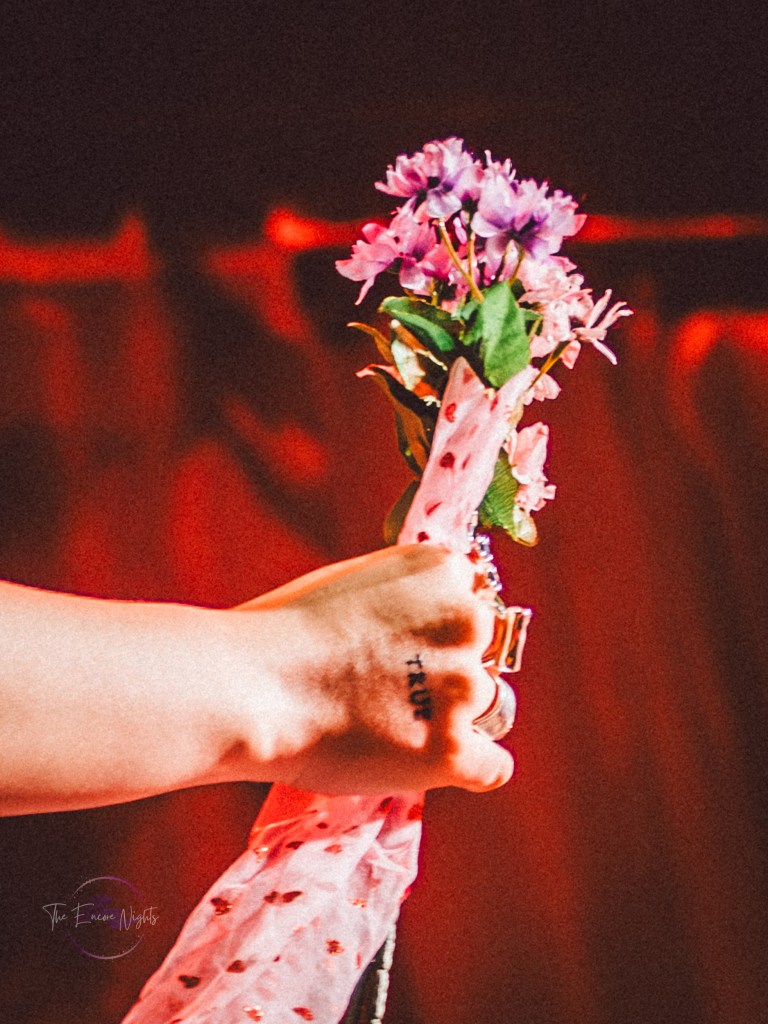 When nine fifteen hit, the lights dimmed and the intro to “If Karma Doesn’t Get You (I Will).” Lauren walked on stage and belted out this powerhouse of a track. Her set design was immaculate. To the left there was a bus stop of the LSS Express. It had a pay phone and a “no stopping emotional arrival zone” sign. A white bench was next to the stop, with a “sad girl” tissue box. On the right stood three white boxes for the singer to stand on. In between the bus stop and boxes was white drape behind the stage with her face in a gray textured design. Lauren played with the phone prop to transition for “Bridesmaids” and “That Part.” Fans did not stop singing her songs the second her set started. She also interacted with fans a lot by grabbing flowers, a “wheel of feels” segment, and “tell me a secret box”, where fans read each other secrets out-loud. Lauren’s music filled the venue, from “Parallel Universe,” a song about an alternate universe where the relationship remained intact, to “Flowers,” where fans sang every lyric back to her.