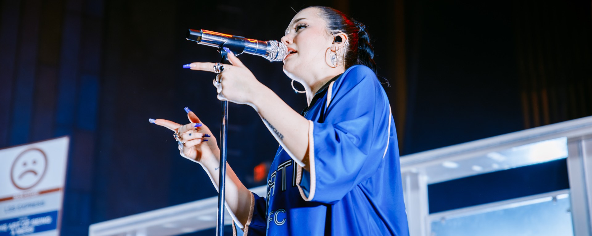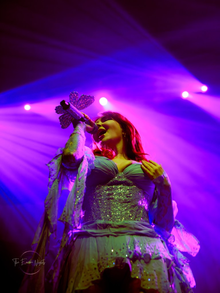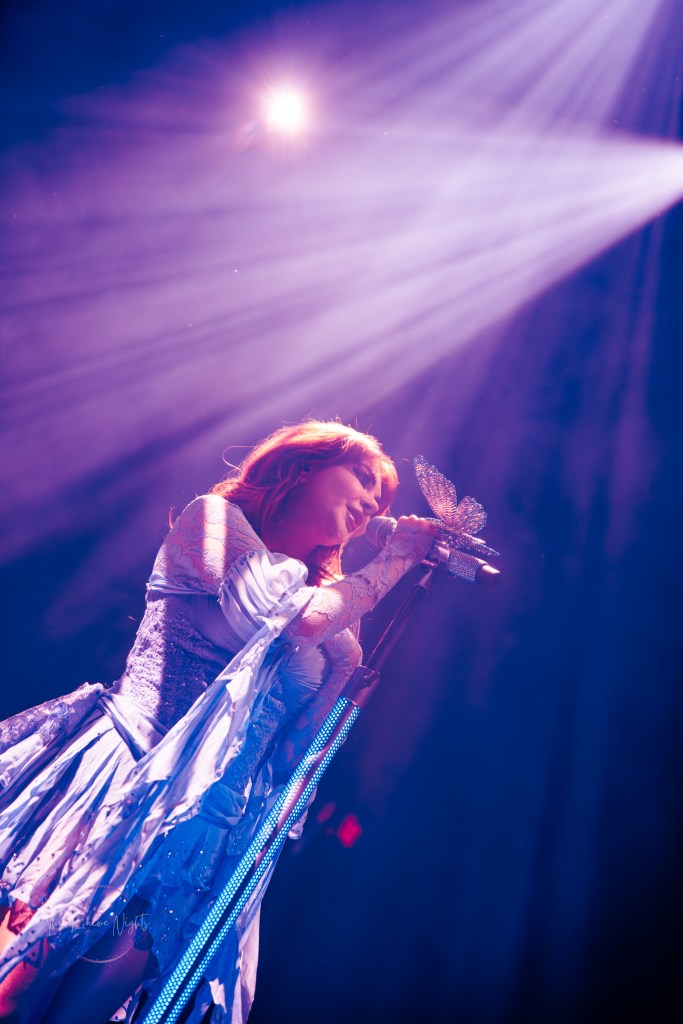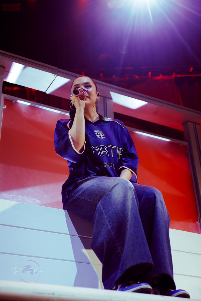 When nine fifteen hit, the lights dimmed and the intro to “If Karma Doesn’t Get You (I Will).” Lauren walked on stage and belted out this powerhouse of a track. Her set design was immaculate. To the left there was a bus stop of the LSS Express. It had a pay phone and a “no stopping emotional arrival zone” sign. A white bench was next to the stop, with a “sad girl” tissue box. On the right stood three white boxes for the singer to stand on. In between the bus stop and boxes was white drape behind the stage with her face in a gray textured design. Lauren played with the phone prop to transition for “Bridesmaids” and “That Part.” Fans did not stop singing her songs the second her set started. She also interacted with fans a lot by grabbing flowers, a “wheel of feels” segment, and “tell me a secret box”, where fans read each other secrets out-loud. Lauren’s music filled the venue, from “Parallel Universe,” a song about an alternate universe where the relationship remained intact, to “Flowers,” where fans sang every lyric back to her.